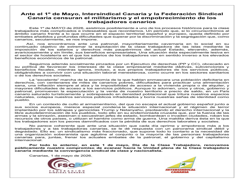 Este 1º de MAYO de 2026, asistimos posiblemente a uno de los procesos históricos para la clase trabajadora más complicados e indeseables que recordamos. Un periodo que, si lo circunscribimos al ámbito canario frente a lo que ocurre en el espacio territorial español y europeo, queda definido por embates añadidos y profundas dificultades que superar por la discriminación y la segregación que, como canarios, secularmente, se nos impone.