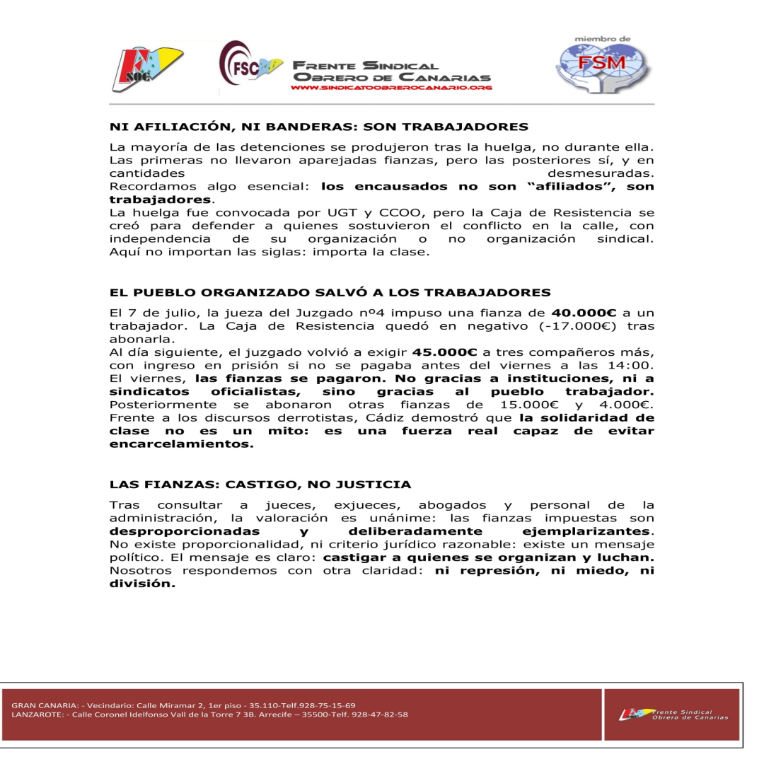El 7 de julio, la jueza del Juzgado nº4 impuso una fianza de 40.000€ a un trabajador. La Caja de Resistencia quedó en negativo (-17.000€) tras abonarla. Al día siguiente, el juzgado volvió a exigir 45.000€ a tres compañeros más, con ingreso en prisión si no se pagaba antes del viernes a las 14:00. El viernes, las fianzas se pagaron. No gracias a instituciones, ni a sindicatos oficialistas, sino gracias al pueblo trabajador. Posteriormente se abonaron otras fianzas de 15.000€ y 4.000€. Frente a los discursos derrotistas, Cádiz demostró que la solidaridad de clase no es un mito: es una fuerza real capaz de evitar encarcelamientos.