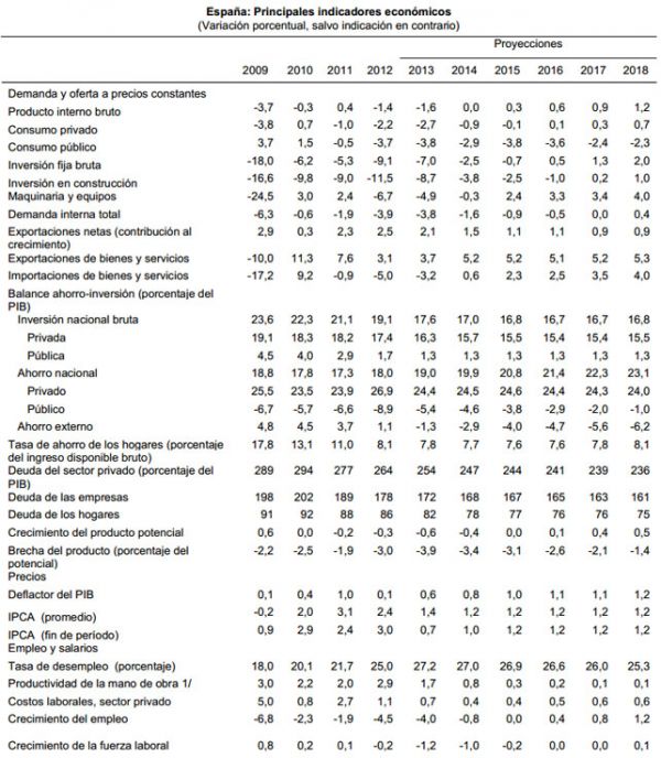 El informe, además, empeora considerablemente sus previsiones de crecimiento para España en el medio plazo y espera que el PIB no crezca por encima del 1% hasta 2018, debido una "débil recuperación" que exige al Gobierno que continúe con las reformas y adopte "nuevas medidas decisivas para generar crecimiento y empleo". El FMI prevé que la economía española caiga un 1,6% este año y se estanque en 2014, tal y como ya adelantó en la actualización de su informe Perspectiva Económica Mundial publicada en julio.