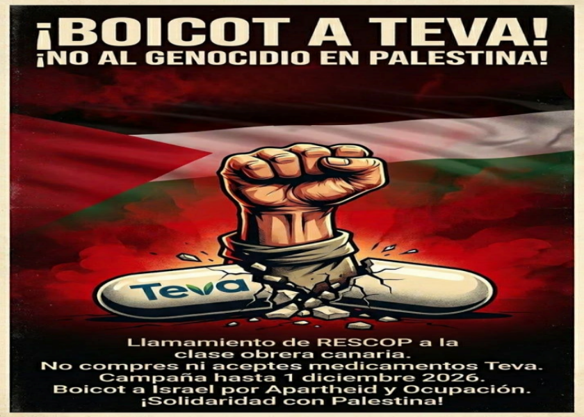 Llamamos a la clase obrera canaria, a las organizaciones sociales y populares en general, a apoyar la campaña ¿Teva? ¡No, gracias!. En primer lugar como personas usuarias de los servicios sanitarios a que no les prescriban medicamentos con el sello de Teva ni tampoco a que se los expendan en su farmacia. En segundo lugar extendiendo este boicot en su ámbito familiar, barrio y centro de trabajo.