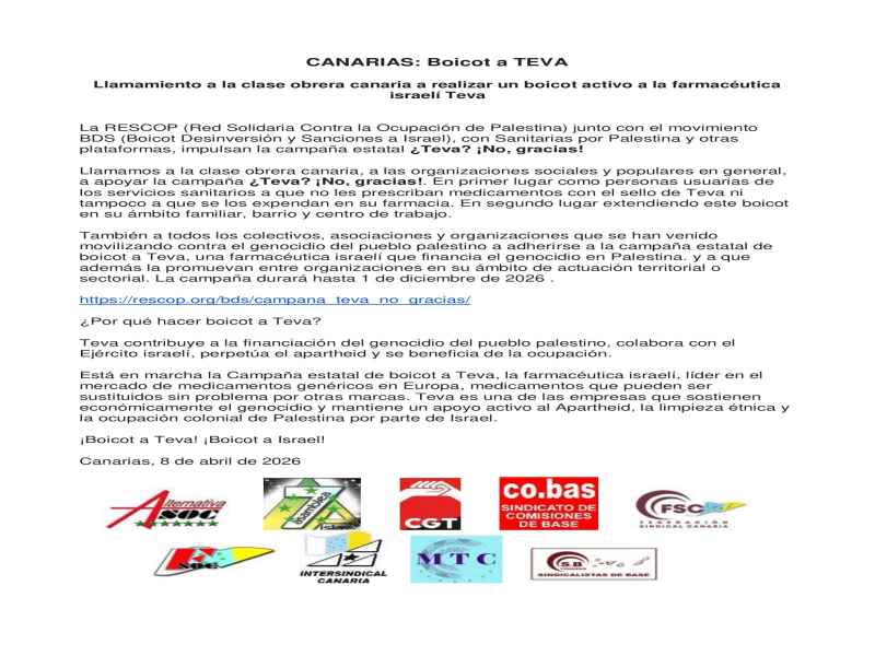 También a todos los colectivos, asociaciones y organizaciones que se han venido movilizando contra el genocidio del pueblo palestino a adherirse a la campaña estatal de boicot a Teva, una farmacéutica israelí que financia el genocidio en Palestina. y a que además la promuevan entre organizaciones en su ámbito de actuación territorial o sectorial. La campaña durará hasta 1 de diciembre de 2026 .