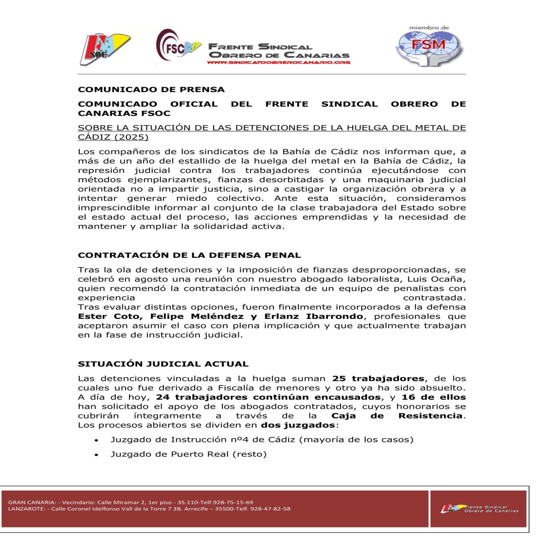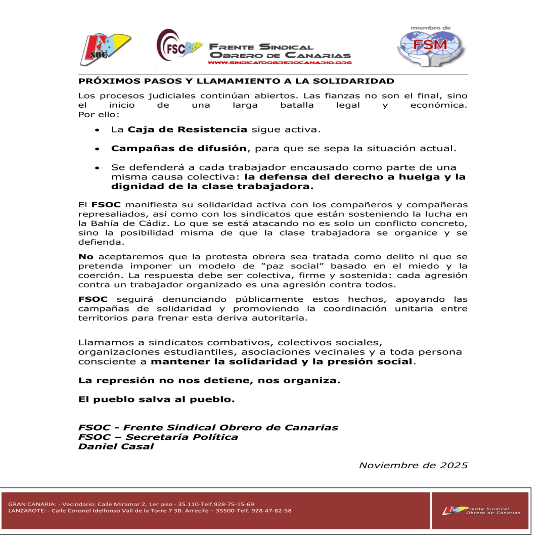 FSOC seguirá denunciando públicamente estos hechos, apoyando las campañas de solidaridad y promoviendo la coordinación unitaria entre territorios para frenar esta deriva autoritaria.